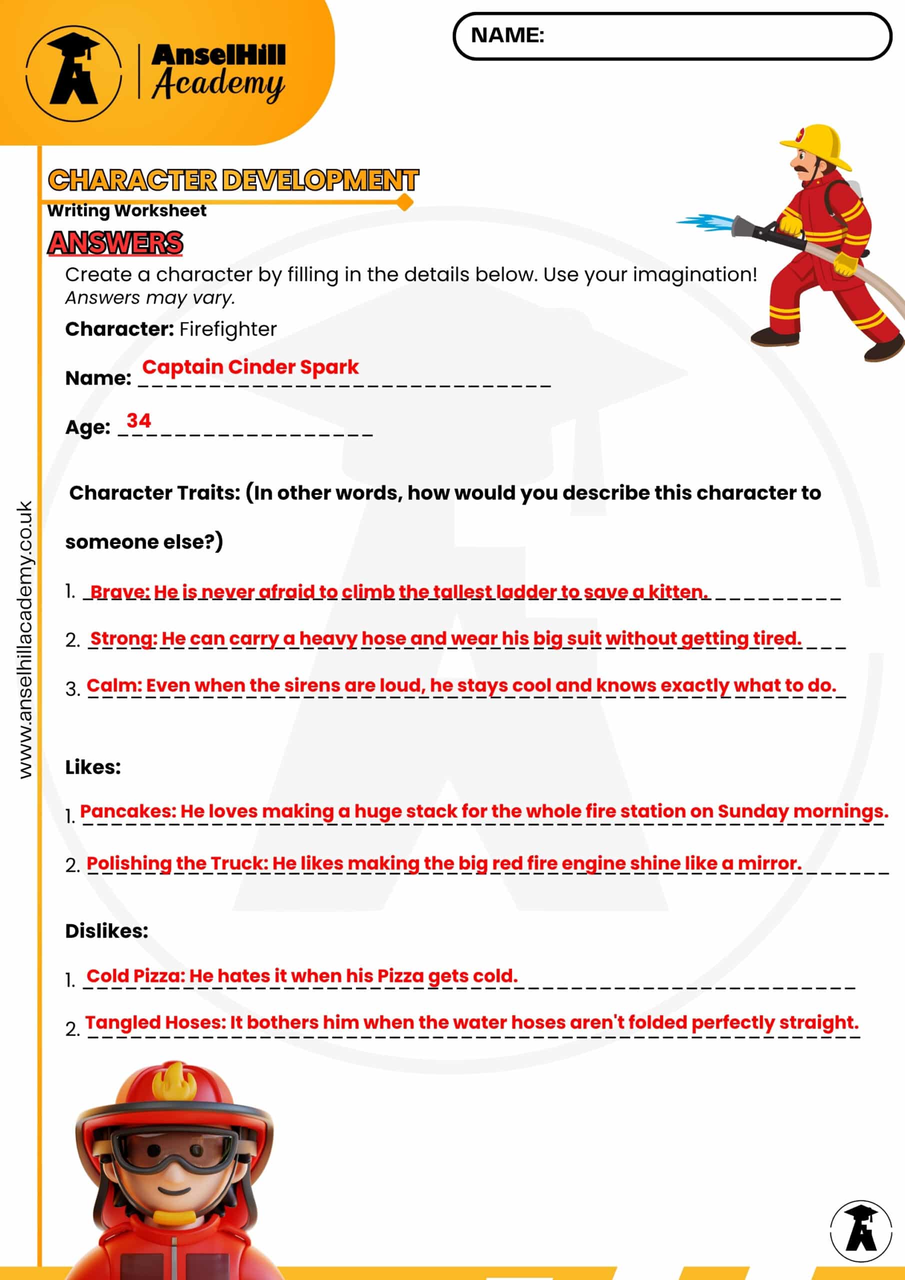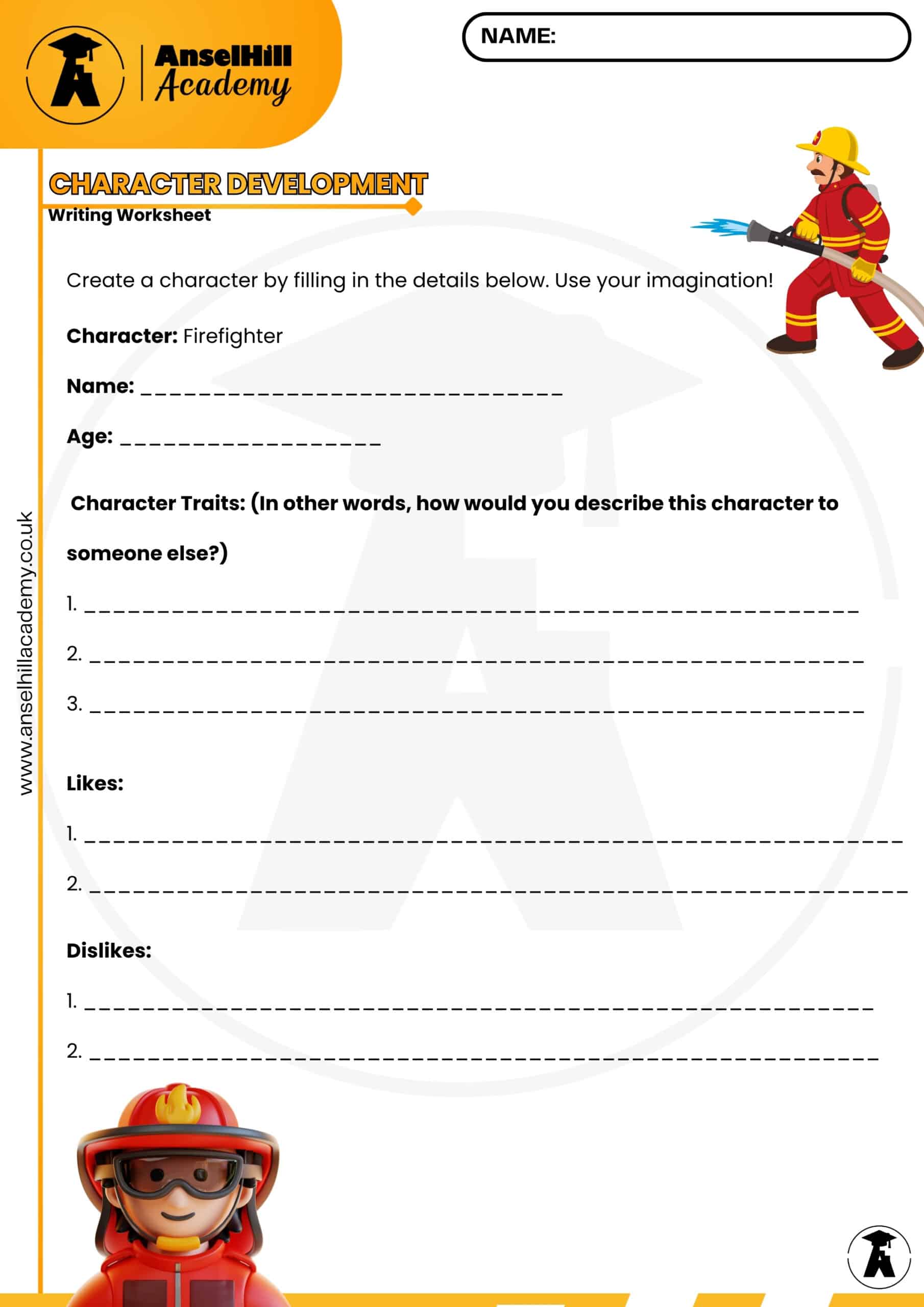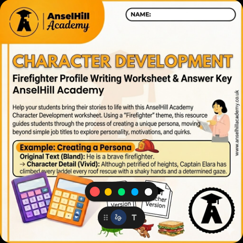 Help your students bring their stories to life with this AnselHill Academy Character Development worksheet. Using a “Firefighter” theme, this resource guides students through the process of creating a unique persona, moving beyond simple job titles to explore personality, motivations, and quirks.