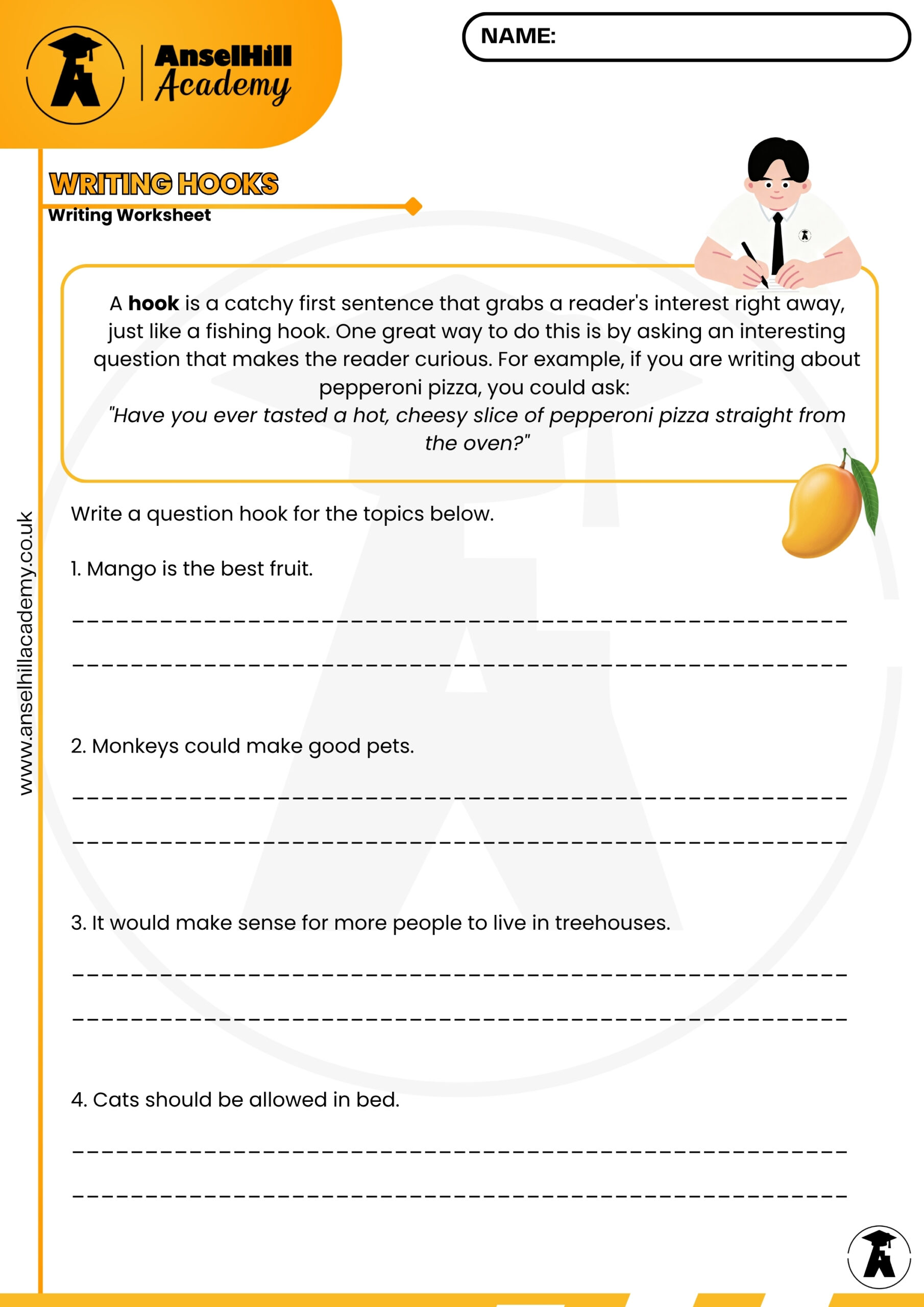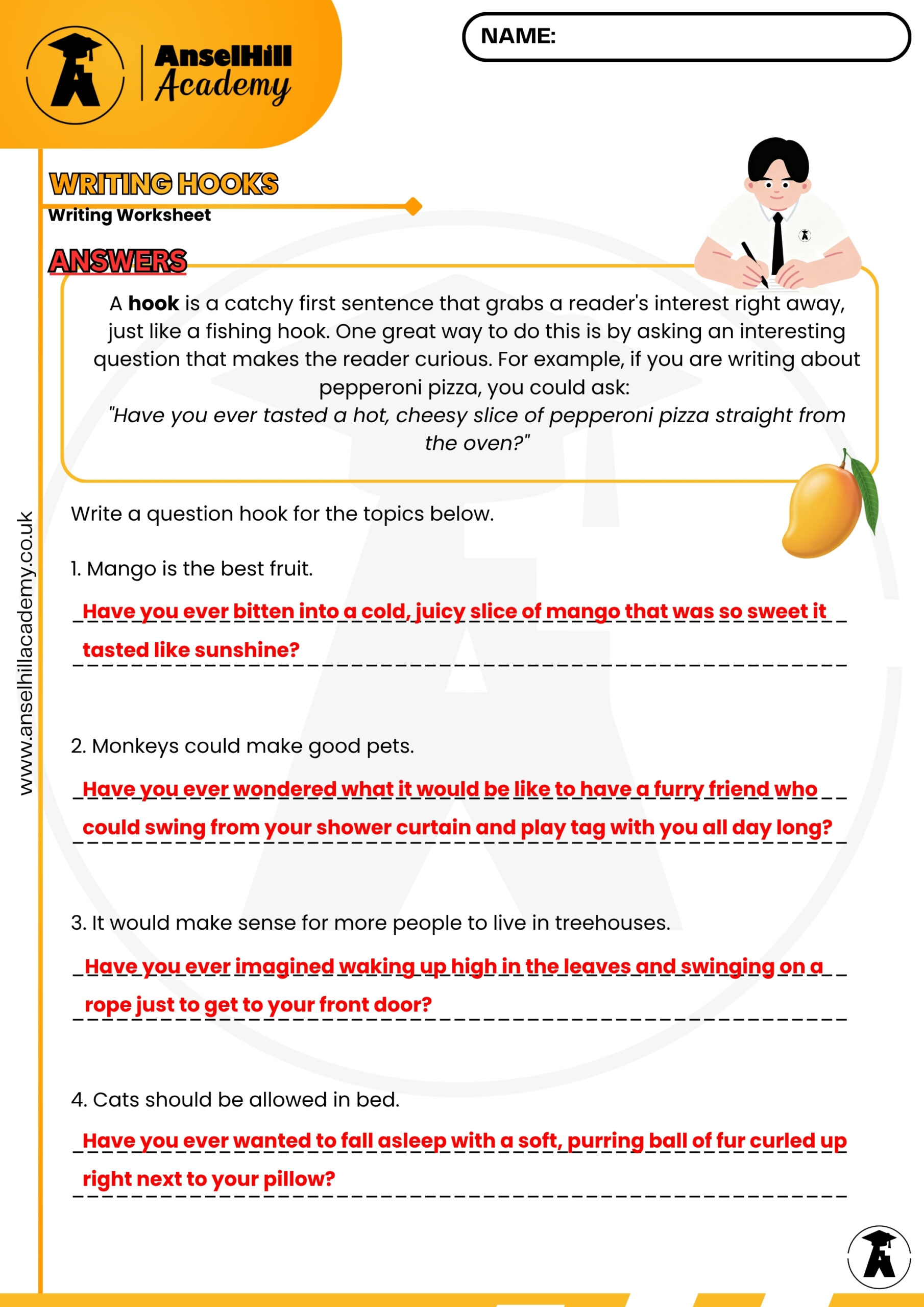 Give your students the tools to start every essay or story with a bang! This AnselHill Academy worksheet focuses on the “Question Hook”—one of the most effective ways to pique a reader’s curiosity and draw them into a piece of writing.